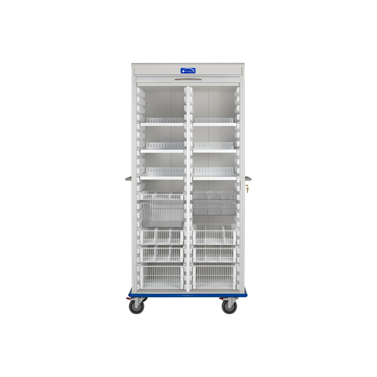 | Two Column, Double Wide LogiCell Catheter Cart with Shelves, Wire Baskets, and Clear Tubs, Tambour Door with Key Lock-(Cat.#2652DTTGKLCAT8) | This Tall, Double Wide, Two Column LogiCell Cart with 6 Shelves, one (1) 3”, four (4) 5” and two (2) 8” Wire Baskets, one (1) 3”, one (1) 5” and one (1) 8” Clear Tubs, is the ideal solution for catheter storage. Our unique LogiCell Wall Panel design allows for flexible placement of additional accessories like Painted steel Shelves, Wire Baskets, and Clear Tubs to organize and store supplies. With a Tambour Door and Key Lock, this secure cart is built to adapt as supply needs and processes change. | 28 × 41 × 80 in | 2652DTTGKLCAT8 | logicell-components | logicell-carts | logicell | |